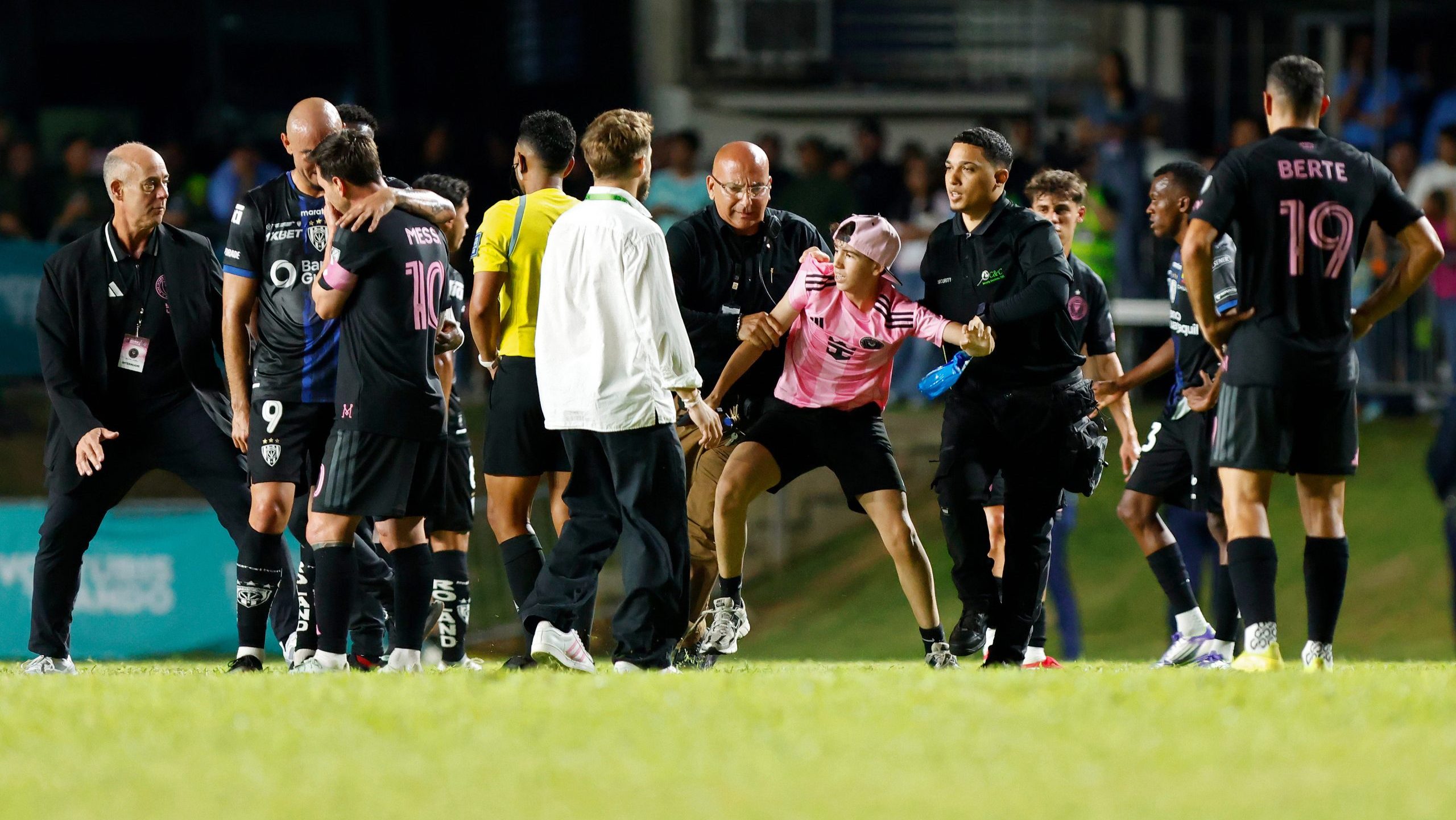 Hubo retrasos y confusión antes del pitido inicial por la falta de entendimiento entre los clubes respecto a los uniformes elegidos. El inicio se demoró una hora más de lo previsto mientras se buscaba una solución que finalmente nunca llegó al terreno. Curiosamente, hubo más camisetas rosas del Inter Miami en la grada que sobre el campo, donde reinó la oscuridad cromática.